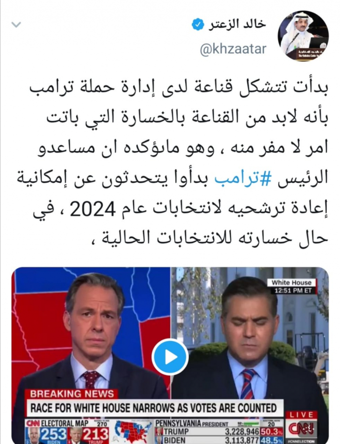 قال المحلل السياسي السعودي خالد الزعتر، إنه بدأت تتشكل قناعة لدى إدارة حملة الرئيس الأمريكي دونالد ترامب بأنه لابد من القناعة بالخسارة التي باتت أمر لا مفر منه.