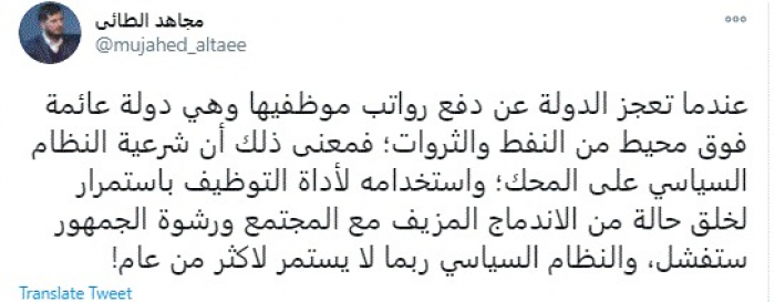 وقال في تغريدة عبر "تويتر" رصدها "المشهد العربي": "عندما تعجز الدولة عن دفع رواتب موظفيها وهي دولة عائمة فوق محيط من النفط والثروات؛ فمعنى ذلك أن شرعية النظام السياسي على المحك؛ واستخدامه لأداة التوظيف باستمرار لخلق حالة من الاندماج المزيف مع المجتمع ورشوة الجمهور ستفشل، والنظام السياسي ربما لا يستمر لاكثر من عام".