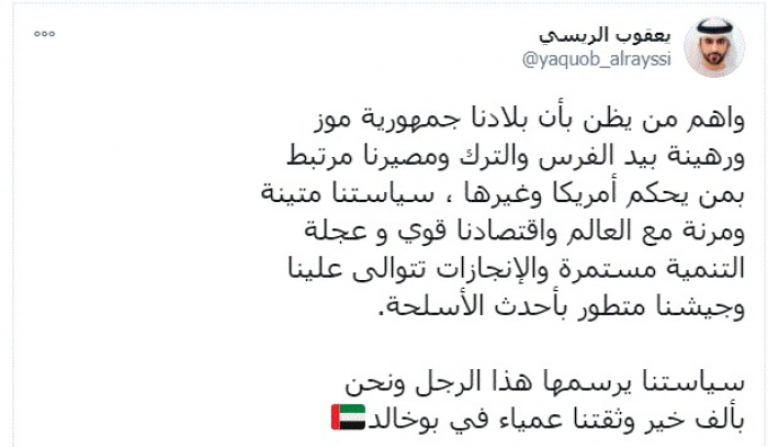 وكتب في تغريدة عبر "تويتر" رصدها "المشهد العربي": "واهم من يظن بأن بلادنا جمهورية موز ورهينة بيد الفرس والترك ومصيرنا مرتبط بمن يحكم أمريكا وغيرها ، سياستنا متينة ومرنة مع العالم واقتصادنا قوي وعجلة التنمية مستمرة والإنجازات تتوالى علينا وجيشنا متطور بأحدث الأسلحة".