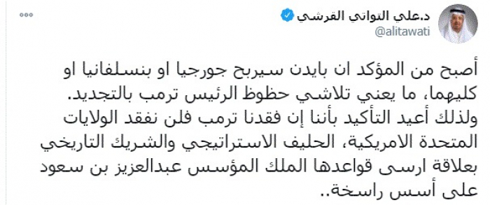 وأضاف: "ولذلك أعيد التأكيد بأننا إن فقدنا ترمب فلن نفقد الولايات المتحدة الأمريكية، الحليف الاستراتيجي والشريك التاريخي بعلاقة أرسى قواعدها الملك المؤسس عبدالعزيز بن سعود على أسس راسخة".