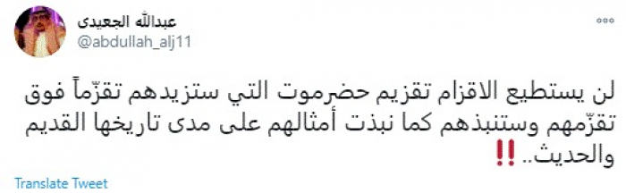 وكتب في تغريدة عبر "تويتر" رصدها "المشهد العربي": "لن يستطيع الأقزام تقزيم حضرموت التي ستزيدهم تقزّمًا فوق تقزّمهم وستنبذهم كما نبذت أمثالهم على مدى تاريخها القديم والحديث".