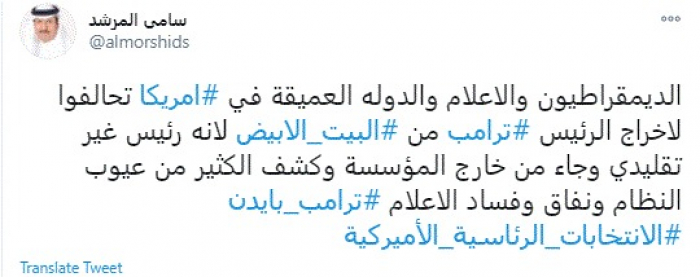 وكتب في تغريدة عبر "تويتر" رصدها "المشهد العربي": "الديمقراطيون والإعلام والدوله العميقة في أمريكا تحالفوا لإخراج الرئيس ترامب من البيت الأبيض لأنه رئيس غير تقليدي وجاء من خارج المؤسسة وكشف الكثير من عيوب النظام ونفاق وفساد الإعلام".