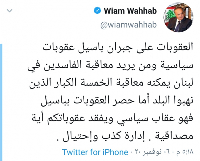وكتب وهاب في تغريدة له عبر "تويتر" رصدها "المشهد العربي": "العقوبات على جبران باسيل عقوبات سياسية ومن يريد معاقبة الفاسدين في لبنان يمكنه معاقبة الخمسة الكبار الذين نهبوا البلد أما حصر العقوبات بباسيل فهو عقاب سياسي ويفقد عقوباتكم أي مصداقية".