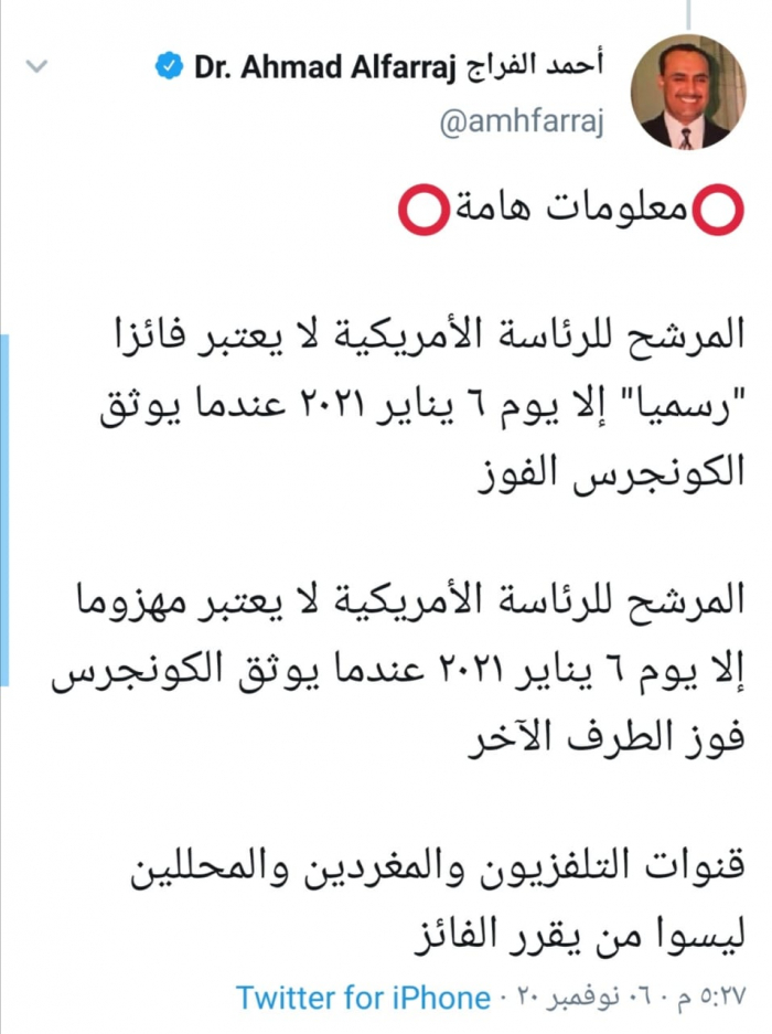 وأضاف الفراج عبر تغريدة له على حسابه بتويتر ورصدها "المشهد العربي" :" معلومات هامة، المرشح للرئاسة الأمريكية لا يعتبر فائزا "رسميا" إلا يوم 6 يناير 2021 عندما يوثق الكونجرس الفوز".