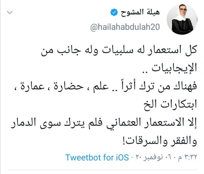 وكتبت المشوح عبر حسابها بتويتر رصدها " المشهد العربي": "كل استعمار له سلبيات وله جانب من الإيجابيات.. فهناك من ترك أثراً علم، حضارة، عمارة، ابتكارات إلخ".
