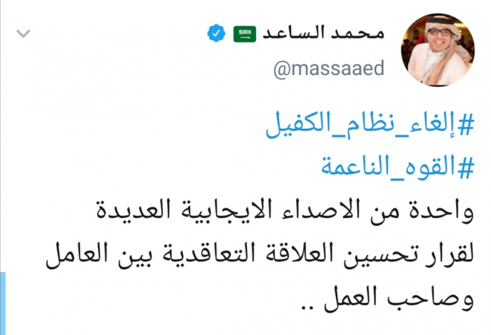 وقال الساعد في تغريدة له عبر "تويتر" رصدها "المشهد العربي" إن "إلغاء نظام الكفيل واحدة من الأصداء الإيجابية العديدة لقرار تحسين العلاقة التعاقدية بين العامل وصاحب العمل".