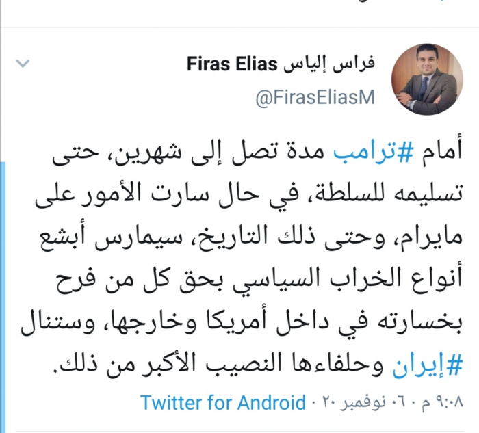 وكتب إلياس في تغريدة له عبر حسابه بتويتر ورصدها المشهد العربي":"أمام ترامب مدة تصل إلى شهرين، حتى تسليمه للسلطة، في حال سارت الأمور على مايرام، وحتى ذلك التاريخ، سيمارس أبشع أنواع الخراب السياسي بحق كل من فرح بخسارته في داخل أمريكا وخارجها، وستنال إيران وحلفاءها النصيب الأكبر من ذلك".
