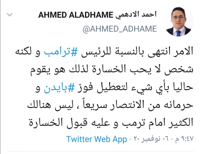 وقال الأدهمي في تغريدة له عبر حسابه بتويتر ورصدها المشهد العربي: "الأمر انتهى بالنسبة للرئيس ترامب ولكنه شخص لا يحب الخسارة لذلك هو يقوم حاليا بأي شيء لتعطيل فوز بايدن وحرمانه من الإنتصار سريعاً"