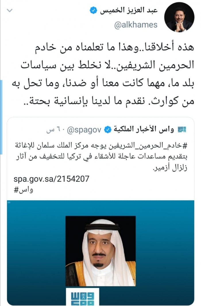 وقال الخميس في تغريدة ‏عبر حسابه بتويتر ورصدها "المشهد العربي" : "‏‏‏‏‏هذه أخلاقنا..وهذا ما تعلمناه من خادم الحرمين الشريفين..لا نخلط بين سياسات بلد ما، مهما كانت معنا أو ضدنا، وما تحل به من كوارث. نقدم ما لدينا بإنسانية بحتة".
