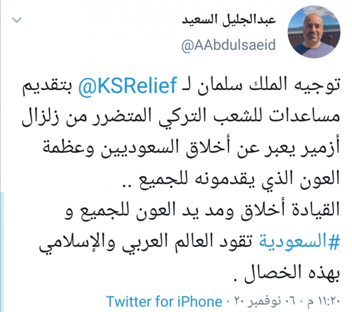 أشاد الإعلامي السوري عبدالجليل السعيد، بقرار المملكة العربية السعودية الخاص بدعم ضحايا زلزال إزمير التركي.