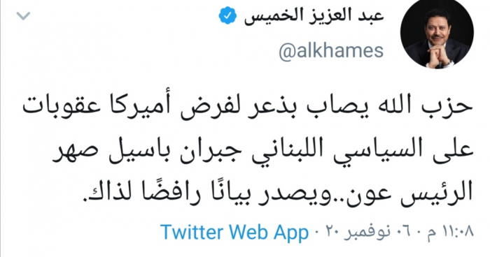 وقال الخميس في تغريدة عبر حسابه بتويتر ورصدها "المشهد العربي" : "حزب الله يصاب بذعر لفرض أميركا عقوبات على السياسي اللبناني جبران باسيل صهر الرئيس عون..ويصدر بيانًا رافضًا لذاك".
