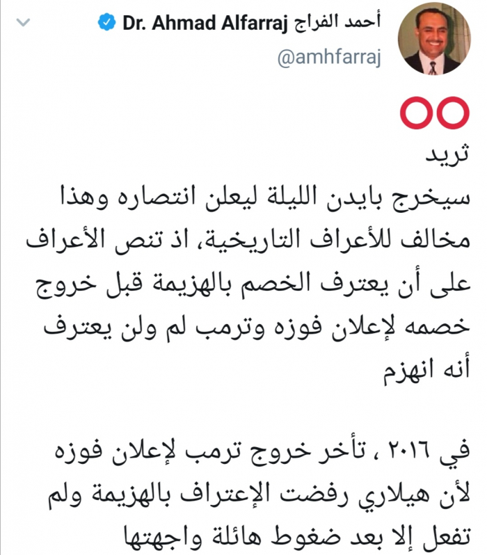 وأكد الفراج عبر تغريدة له على حسابه بتويتر ورصدها "المشهد العربي" أن "الأعراف تنص على أن يعترف الخصم بالهزيمة قبل خروج خصمه لإعلان فوزه وترمب لم ولن يعترف أنه انهزم".