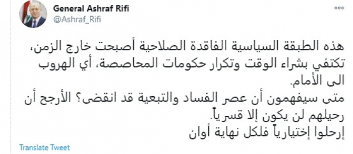 طالب السياسي اللبناني البارز اللواء أشرف ريفي، اليوم، الطبقة السياسية الحاكمة في لبنان بالرحيل، مؤكدًا أن تلك الطبقة أصبحت خارج الزمن.