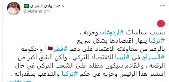 الشهري: الاقتصاد التركي ينهار بشكل سريع بسبب سياسات أردوغان