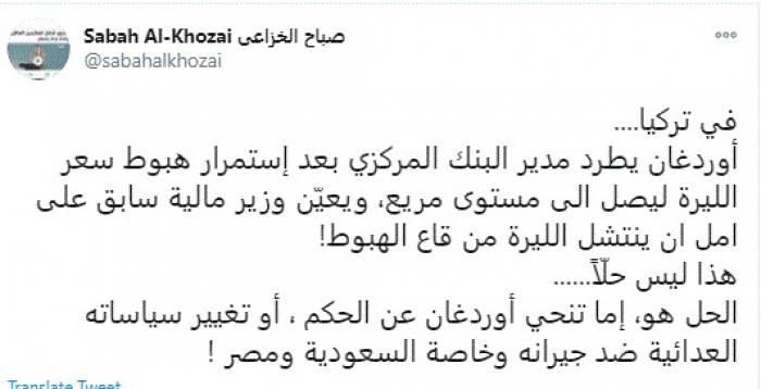وقال في تغريدة عبر "تويتر" رصدها "المشهد العربي": "في تركيا.. أرودغان يطرد مدير البنك المركزي بعد استمرار هبوط سعر الليرة ليصل الى مستوى مريع، ويعيّن وزير مالية سابق على امل ان ينتشل الليرة من قاع الهبوط".
