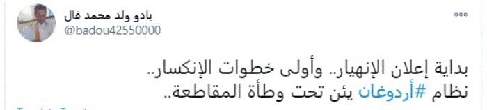 وقال في تغريدة عبر "تويتر" رصدها "المشهد العربي": "بداية إعلان الانهيار.. وأولى خطوات الانكسار.. نظام أردوغان يئن تحت وطأة المقاطعة".