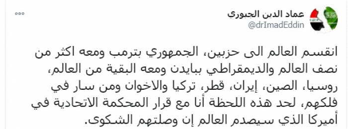 الجبوري: العالم انقسم لحزبين بسبب انتخابات أمريكا