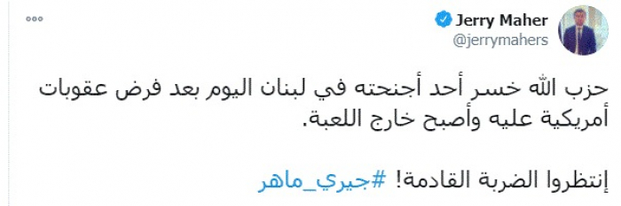 وكتب في تغريدة عبر "تويتر" رصدها "المشهد العربي": "حزب الله خسر أحد أجنحته في لبنان اليوم بعد فرض عقوبات أمريكية عليه وأصبح خارج اللعبة. انتظروا الضربة القادمة".