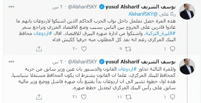 وقال في تغريدات عبر "تويتر" رصدها "المشهد العربي": "تغريدات حول ما حدث في البنك المركزي تركيا: تجاوز الرئيس أردوغان القانون مرة ثانية بإقالة محافظ البنك المركزي الذي ليس من صلاحياته إقالته قبل انتهاء فترة خدمته حسب نص الدستور. أول مرة عملها اردوغان كانت لأن محافظ البنك يرفض تعليماته بخفض سعر الفائدة لكن هذه المرة أسبابها غير".
