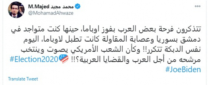 وقال في تغريدة عبر "تويتر" رصدها "المشهد العربي": "تتذكرون فرحة بعض العرب بفوز اوباما، حينها كنت متواجد في دمشق بسوريا وعصابة المقاولة كانت تطبل لاوباما، اليوم نفس الدبكة تتكرر!! وكأن الشعب الأمريكي يصوت وينتخب مرشحه من أجل العرب والقضايا العربية؟".