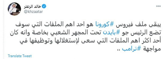 وكتب في تغريدة عبر "تويتر" رصدها "المشهد العربي": "يبقى ملف فيروس كورونا هو أحد أهم الملفات التي سوف تضع الرئيس جو بايدن تحت المجهر الشعبي بخاصة وانه كان أحد اكثر اهم الملفات التي سعى لإستغلالها وتوظيفها في مواجهة ترامب".