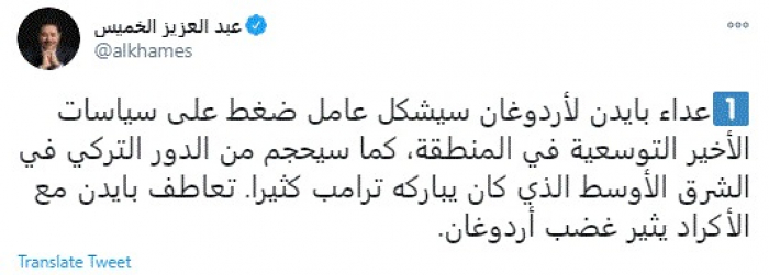 وقال في تغريدة عبر "تويتر" رصدها "المشهد العربي": "عداء بايدن لأردوغان سيشكل عامل ضغط على سياسات الأخير التوسعية في المنطقة، كما سيحجم من الدور التركي في الشرق الأوسط الذي كان يباركه ترامب كثيرا. تعاطف بايدن مع الأكراد يثير غضب أردوغان".