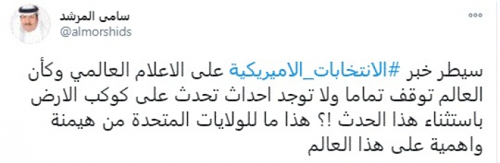 وقال في تغريدة عبر "تويتر" رصدها "المشهد العربي": "سيطر خبر الانتخابات الأمريكية على الإعلام العالمي وكأن العالم توقف تماما ولا توجد أحداث تحدث على كوكب الأرض باستثناء هذا الحدث!؟ هذا ما للولايات المتحدة من هيمنة على هذا العالم".