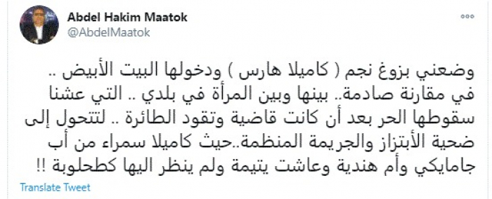 وقال في تغريدة عبر "تويتر" رصدها "المشهد العربي": "وضعني بزوغ نجم (كاميلا هارس) ودخولها البيت الأبيض.. في مقارنة صادمة.. بينها وبين المرأة في بلدي .. التي عشنا سقوطها الحر بعد أن كانت قاضية وتقود الطائرة".