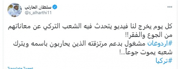 وكتب في تغريدة عبر "تويتر" رصدها "المشهد العربي": "كل يوم يخرج لنا فيديو يتحدث فيه الشعب التركي عن معاناتهم من الجوع والفقر! أردوغان مشغول بدعم مرتزقته الذين يحاربون باسمه ويترك شعبه يموت جوعاً".