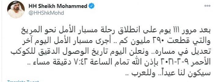 وأضاف: "ونعلن اليوم تاريخ الوصول الدقيق للكوكب الأحمر ٩-٢-٢٠٢١ بإذن الله تمام الساعة ٧:٤٢ دقيقة مساء .. سيكون لنا عيداً.. وللعرب".