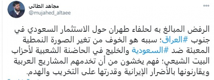 وقال في تغريدة عبر "تويتر" رصدها "المشهد العربي": "الرفض المبالغ به لحلفاء طهران حول الاستثمار السعودي في جنوب العراق؛ سببه هو الخوف من تغير الصورة النمطية المعبئة ضد السعودية والخليج في الحاضنة الشعبية لأحزاب البيت الشيعي".