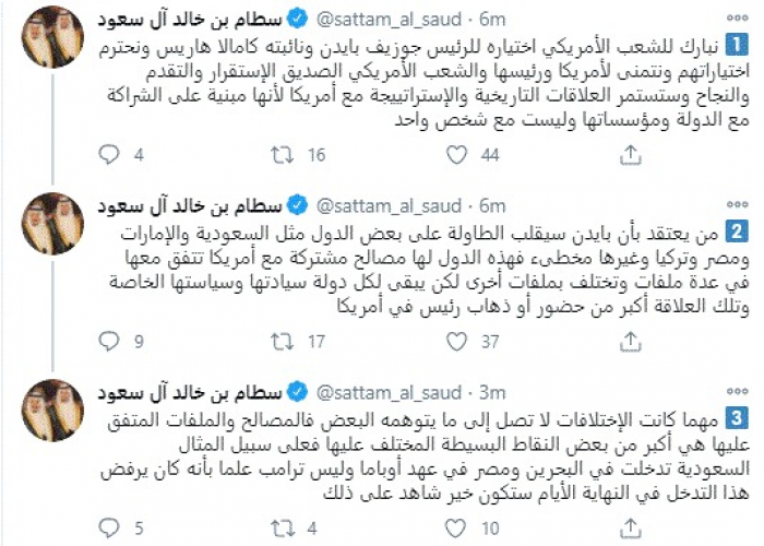 أكد الأمير السعودي البارز سطام بن خالد آل سعود، اليوم، أن السعودية والإمارات ومصر لهم علاقات استراتيجية ومصالح مشتركة مع أمريكا، وذلك ردًا على بعض الأكاذيب التي روجتها أبواق جماعة الإخوان الإرهابية بعد فوز جو بايدن بماراثون الانتخابات الرئاسية الأمريكية.