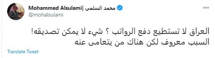 وقال في تغريدة عبر "تويتر" رصدها "المشهد العربي": "العراق لا تستطيع دفع الرواتب ؟ شيء لا يمكن تصديقه! السبب معروف لكن هناك من يتعامى عنه".