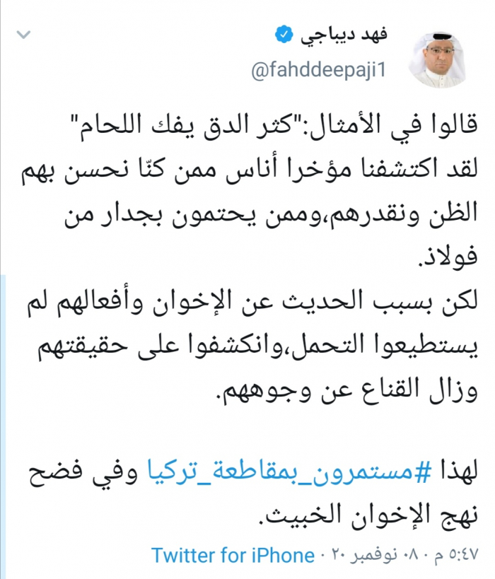 واختتم تغريدته بقوله "لهذا #مستمرون_بمقاطعة_تركيا وفي فضح نهج الإخوان الخبيث".