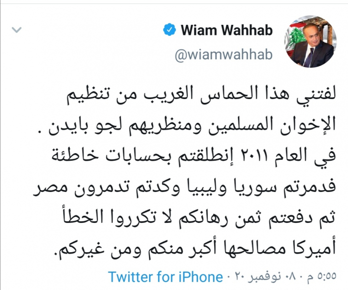 وقال وهاب في تغريدة له عبر "تويتر" رصدها "المشهد العربي": "لفتني هذا الحماس الغريب من تنظيم الإخوان المسلمين ومنظريهم لجو بايدن".
