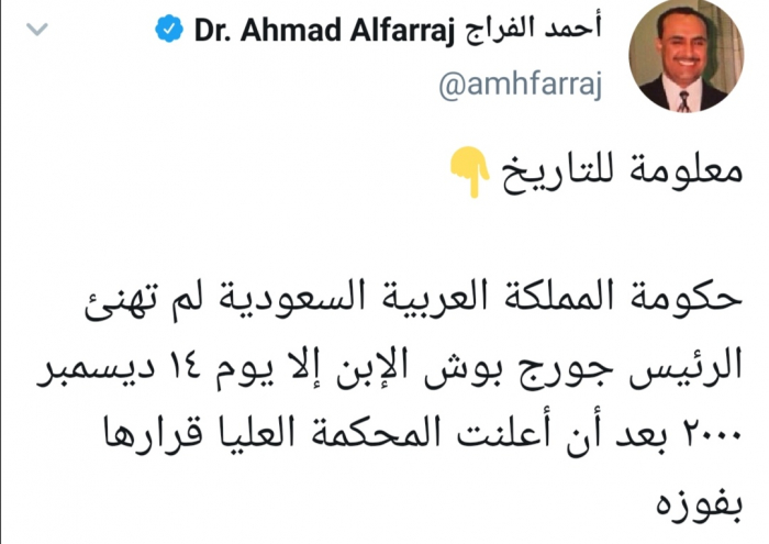 وكتب الفراج عبر تغريدة له على حسابه بتويتر ورصدها "المشهد العربي" معلومة للتاريخ، حكومة المملكة العربية السعودية لم تهنئ الرئيس جورج بوش الابن إلا يوم 14 ديسمبر 2000 بعد أن أعلنت المحكمة العليا قرارها بفوزه".