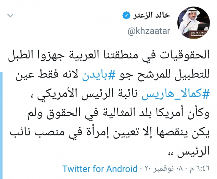 وقال الزعتر عبر تغريدة له على "تويتر" رصدها "المشهد العربي": "الحقوقيات في منطقتنا العربية جهزوا الطبل للتطبيل للمرشح جو بايدن لأنه فقط عين كامالا هاريس نائبة الرئيس الأمريكي، وكأن أمريكا بلد المثالية في الحقوق ولم يكن ينقصها إلا تعيين إمرأة في منصب نائب الرئيس".