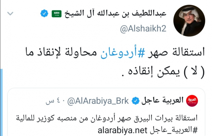 وقال آل الشيخ في تغريدة له عبر حسابه بتويتر ورصدها "المشهد العربي": "استقالة صهر أردوغان محاولة لإنقاذ ما (لا) يمكن إنقاذه".
