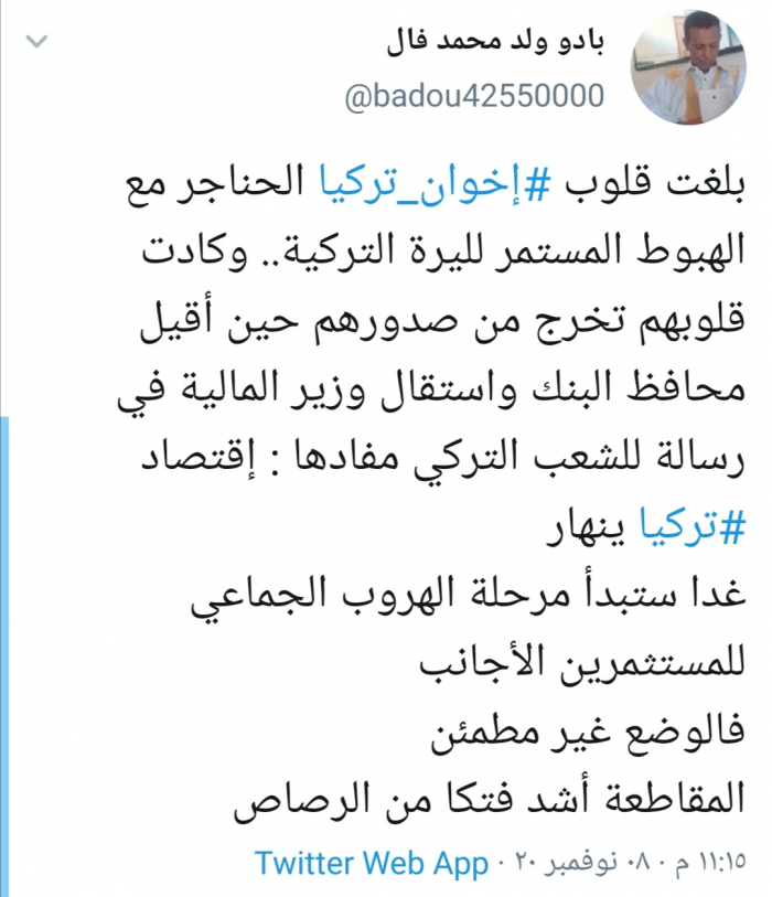 قال الكاتب الصحفي الموريتاني بادو ولد محمد فال، إن قلوب إخوان تركيا بلغت الحناجر مع الهبوط المستمر لليرة التركية.