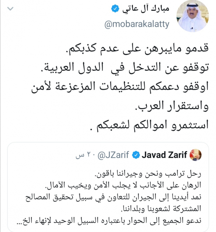 وكتب آل عاتي عبر تغريدة له على "تويتر" رصدها " المشهد العربي" مخاطبا ظريف: "قدمو مايبرهن على عدم كذبكم، توقفوا عن التدخل في الدول العربية".