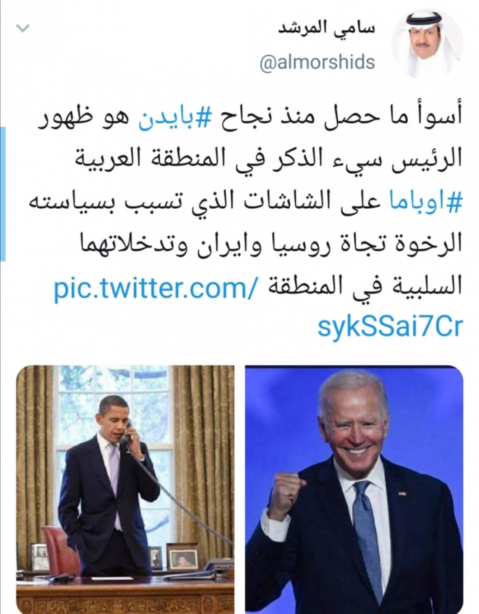 وقال المرشد في تغريدة له عبر حسابه بتويتر ورصدها "المشهد العربي": "أسوأ ما حصل منذ نجاح بايدن هو ظهور الرئيس سيء الذكر في المنطقة العربية أوباما على الشاشات الذي تسبب بسياسته الرخوة تجاة روسيا وإيران وتدخلاتهما السلبية في المنطقة".