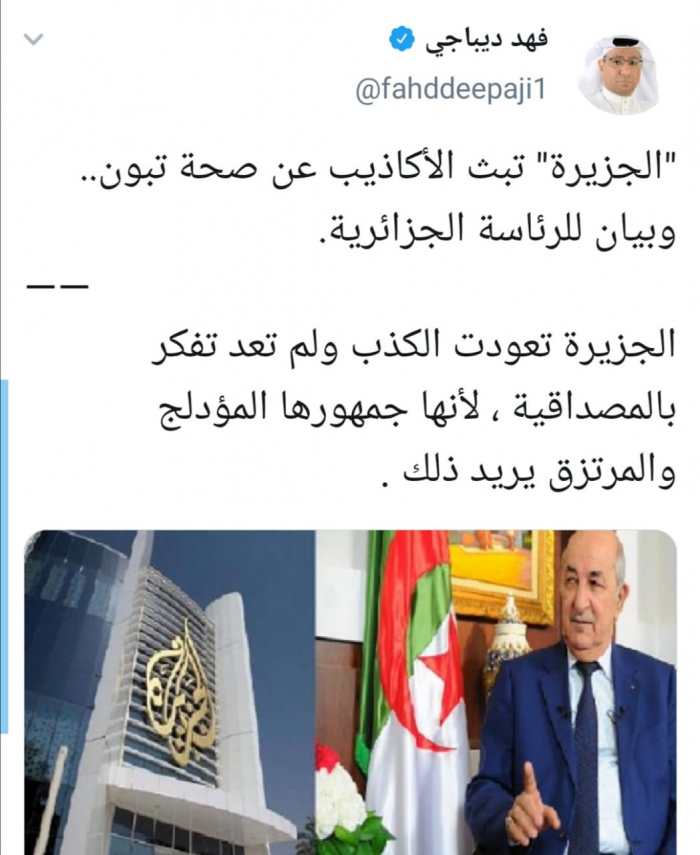 وقال ديباجي عبر حسابه في تويتر ورصدها "المشهد العربي": "الخلاصة: " "الجزيرة" تبث الأكاذيب عن صحة تبون.. وبيان للرئاسة الجزائرية".