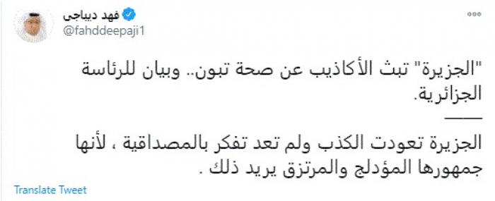 انتقد المحلل السياسي السعودي فهد ديباجي، اليوم، قناة الجزيرة القطرية جراء بثها للأكاذيب عن صحة الرئيس الجزائري عبدالمجيد تبون بنشر مزاعم عن وفاته.