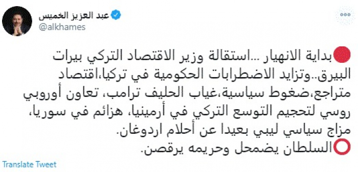 وقال في تغريدة عبر "تويتر" رصدها "المشهد العربي": "بداية الانهيار... استقالة وزير الاقتصاد التركي بيرات البيرق.. وتزايد الاضطرابات الحكومية في تركيا، اقتصاد متراجع، ضغوط سياسية، تعاون أوروبي روسي لتحجيم التوسع التركي في أرمينيا، هزائم في سوريا، مزاج سياسي ليبي بعيدا عن أحلام اردوغان. السلطان يضمحل وحريمه يرقصن".