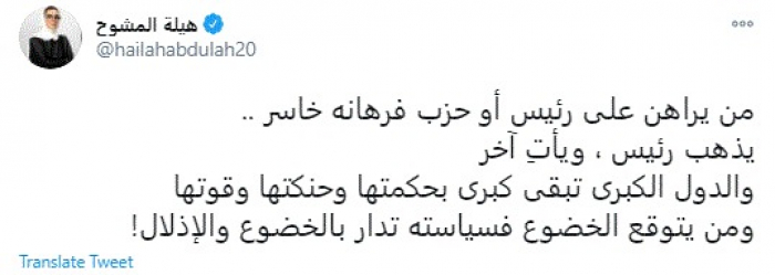وكتبت في تغريدة عبر "تويتر" رصدها "المشهد العربي": "من يراهن على رئيس أو حزب فرهانه خاسر.. يذهب رئيس ، ويأتِ آخر والدول الكبرى تبقى كبرى بحكمتها وحنكتها وقوتها ومن يتوقع الخضوع فسياسته تدار بالخضوع والإذلال".