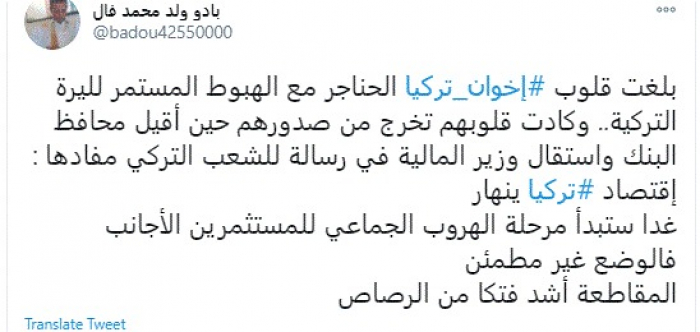ألمح الكاتب الصحفي الموريتاني بادو ولد محمد فال، اليوم، إلى اقتراب انهيار الاقتصاد التركي، مؤكدًا أن الفترة المقبلة ستشهد هروب للمستثمرين الأجانب من تركيا بعد استقالة صهر أردوغان بيرات البيرق من منصبه.