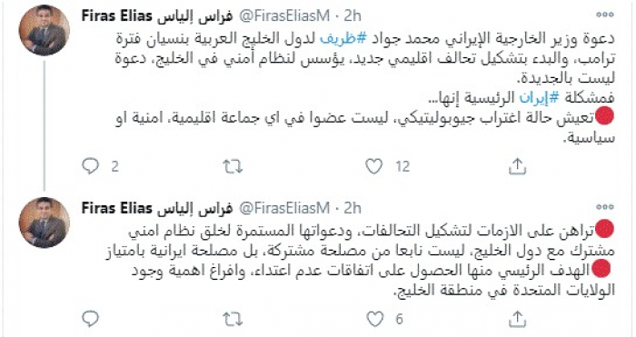 وكتب في تغريدة عبر "تويتر" رصدها "المشهد العربي": "دعوة وزير الخارجية الإيراني محمد جواد ظريف لدول الخليج العربية بنسيان فترة ترامب، والبدء بتشكيل تحالف إقليمي جديد، يؤسس لنظام أمني في الخليج، دعوة ليست بالجديدة".