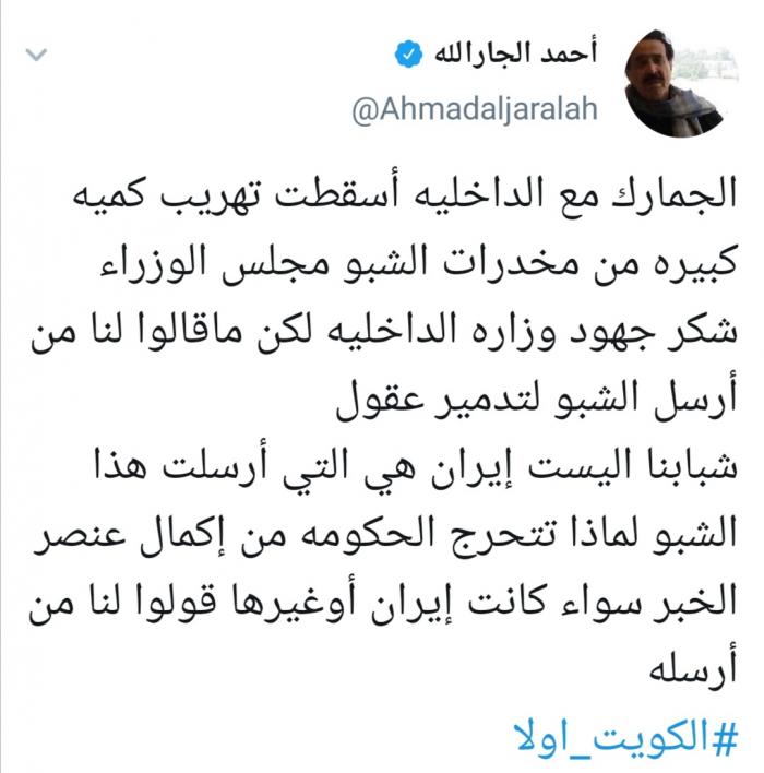 وأضاف الجار الله: "أليست إيران هي التي أرسلت هذا الشبو لماذا تتحرج الحكومة من إكمال عنصر الخبر سواء كانت إيران أوغيرها قولوا لنا من أرسله".