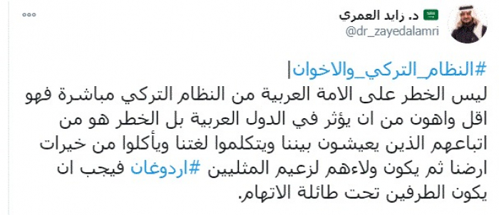 وقال في تغريدة عبر "تويتر" رصدها "المشهد العربي": "النظام التركي والإخوان| ليس الخطر على الأمة العربية من النظام التركي مباشرة فهو أقل وأهون من أن يؤثر في الدول العربية بل الخطر هو من أتباعهم الذين يعيشون بيننا ويتكلموا لغتنا ويأكلوا من خيرات أرضنا ثم يكون ولاءهم لزعيم المثليين أردوغان فيجب أن يكون الطرفين تحت طائلة الاتهام".