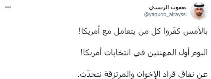 وقال في تغريدة عبر "تويتر" رصدها "المشهد العربي": "بالأمس كفّروا كل من يتعامل مع أمريكا! اليوم أول المهنئين في انتخابات أمريكا! عن نفاق قراد الإخوان والمرتزقة نتحدّث".